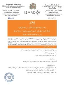 تعلن إدارة المعهد العالي لمهن السمعي البصري والسينما ISMAC عن بدأ عملية الترشيح القبلي لمباراة لولوج السنة الأولى من ” إجازة الدراسات السينمائية والسمعية البصرية” برسم السنة الجامعية 2025  /2026 بملحقة المعهد بمدينة الداخلة  . عدد المقاعد : 40 ، واخر أجل للترشيح 26 أكتوبر 2025 .