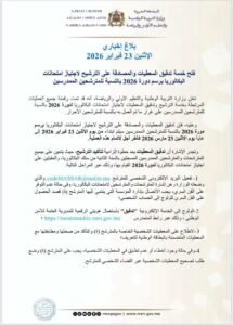 تدقيق المعطيات والمصادقة على الترشيح لاجتياز امتحانات البكالوريا برسم دورة 2026 بالنسبة للمترشحين الممدرسين، سيتم ابتداء من يوم الاثنين 23 فبراير 2026 إلى غاية يوم الاثنين 23 مارس 2026، كآخر أجل لإتمام هذه العملية.